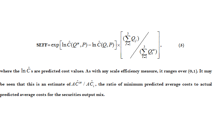 Scale efficiency is measured based on the cost function in (2) as well. For each firm’s output mix and input prices, a U-shaped multiproduct average cost curve was traced out, and the scale-efficient output vector Qse at the bottom of the U was determined. The scale efficiency was determined as the ratio of predicted cost of Qse to the predicted cost of the bank’s actual output Q, multiplied by the ratio of outputs to correct for absolute size differences: