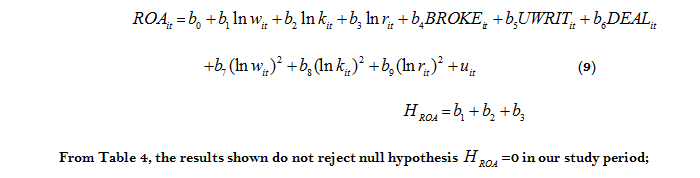 Tsutsui and Kamesaka (2005) state that the basic regression equation can be used to test for degree of contestability in securities firms; these empirical functions include a full translog function, a partial translog function and a Cobb-Douglas function. Our observations only number 162 in this study. While we used a full translog function to measure the degree of competition for securities firms, this may cause a bias problem with the degree of freedom. As a result, the partial translog function and a Cobb-Douglas function are considered. The partial translog function is as below: