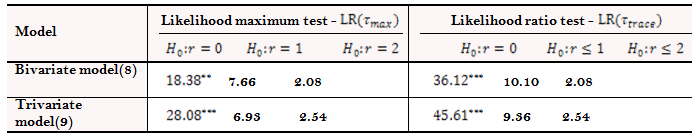 Note: Numbers in parentheses of models refer to the optimal lag orders determined by the AIC rule. r is the co-integration rank. ** and *** represents the null is rejected under the 5% and 1% significant level, respectively, and the critical values are obtained from the asymptotic critical values (Osterwald‐Lenum, 1992 ).