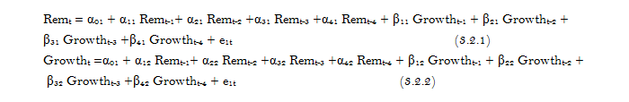 We test whether Growtht-1, Growtht-2, Growtht-3 and Growtht-4 do not appear in the Remittancest equation to test Growth does not cause Remittances, and Remittancest-1, Remittancest-2, Remittancest-3 and Remittancest-4 do not appear in the Growtht equation to test Remittances does not cause Growth.