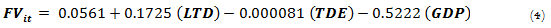 The empirical model above shows that long-term debt to total-assets ratio has a positive and significant effect on firm value. This suggested that a 1% improvement in long-term debt to total-assets ratio increased the firm value of banks by around 2%, ceteris paribus. However, total debt to equity ratio had a negative and significant impact on firm value. This suggested that a decrease in total debt to equity ratio by 1%, improved firm value by 0.001%, ceteris paribus. The GDP had a negative and significant effect on the firm value. The consequence was that unfavorable economic growth would decrease firm value by around 5%, ceteris paribus.