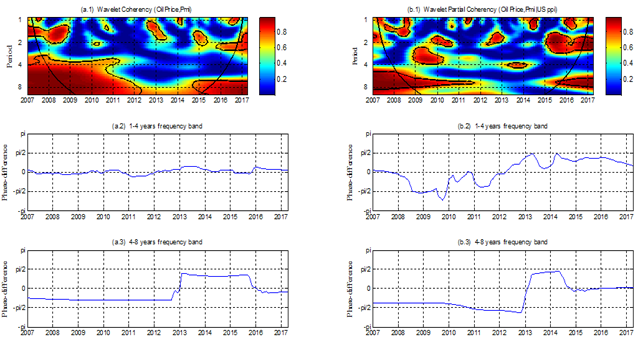 After adding the control variable of Chinese PPI, Figure (b.2) shows the short-term relationship of PPI to the WTI crude oil price and Chinese PMI between the time and frequency dimensions: from 2007 to 2008, both moved together; from 2010 to 2012, they were positively correlated, with oil prices leading PMI in the absence of the control variable; while during 2013–2014 and 2015–2016, although still positively correlated, PMI led oil prices. Figure (b.3) shows a long-term significant correlation between oil prices and PMI, in which the former was led by the latter, for both 2008–2012 and 2015–2016; however, whereas the correlation was negative in the earlier period, it was positive later on. Thus, when examining the long- and short-term causal relationship between international crude oil prices and the Chinese PMI after 2013, the latter exerted a positive impact on the former. This is consistent with both Kilian’s (2009) and Kaufmann and Ullman’s (2009