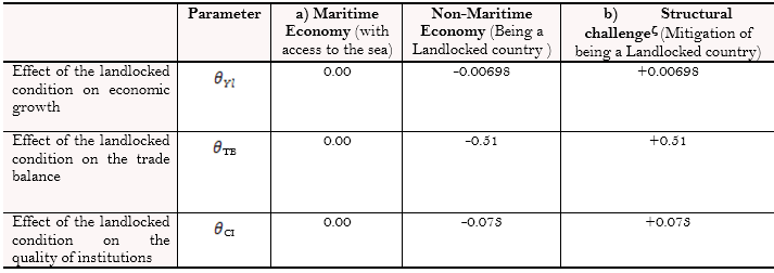 Consequently, the parameters were considered and calibrated for those economies with opens access to the sea (Maritime Economies); by the contrary, a negative effect is expected for landlocked countries (Non-Maritime Economies) less economic growth, lower trade balance and worse institutional quality index, therefore, the structural challenge is constituted in a sensitivity analysis with opposite coefficients to the empirical evidence found in the mentioned literature of Table 1 (sources) for countries without access to the sea.