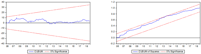 Assuming the bounds test concludes the presence of cointegration, the second stage of the ARDL procedure was to estimate long term coefficients and short term coefficients via the error correction model (ECM) framework. These coefficients derived from ECM implied the speed of adjustment of the short term disequilibrium to the long term equilibrium.