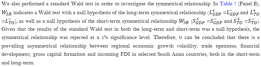 In Equation 11, ‘m’, ‘n’ and ‘r’ denote the optimal estimated lag length for a model. A standard Wald test will then be performed in order to determine the long-term asymmetric effects, from financial development, trade openness, FDI, inflation, and economic growth, using the following null hypothesis of symmetry: