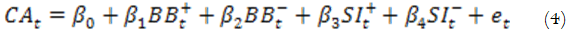 , in equations 5 and 6 respectively, are the partial sums of the positive and negative changes in a government’s budget balance. They are calculated as follows (Dhaoui & Bacha, 2017):