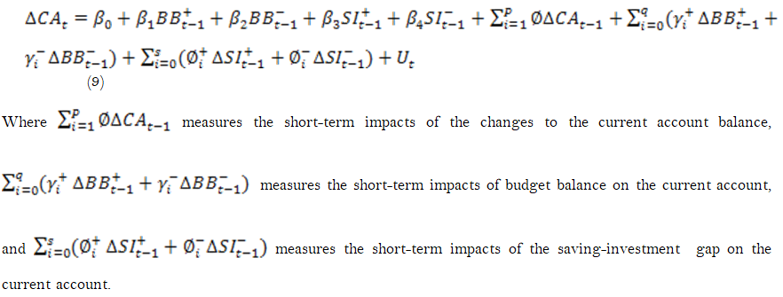 A NARDL model is used to analyze the relationship between external balance, represented by current account balance, and the internal balance, represented by fiscal balance and saving-investment balance. In the case of a linear ARDL model, both negative and positive changes are thought to have an equal impact on the dependent variable. Recently, it has been found that negative changes may have a greater impact than positive changes on current account balance. Consequently, due to such asymmetries, non-linear models are thought to be more appropriate (Turan & Karakas, 2018). A NARDL model was developed by Shin, Yu, and Greenwood-Nimmo (2014) as an extension to the ARDL model presented by Pesaran (1997). The main objective of the NARDL model is to take into consideration both the short- and long-term asymmetries in the variables of interest while maintaining all the advantages of the ARDL approach (Cheah, Yiew, & Ng, 2017).
