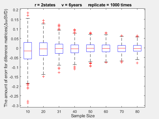 The simulation results in Figure 6 present an experiment that uses two states, has a frequency of time of six years, and is replicated 1000 times to evaluate the error. This differentiates between matrices using the value of a singular metric in order to reach a sufficient sample size, so that the transition matrices can be estimated. Typically, the experiment is performed using different sample sizes. However, 10 and 20 were considered to be insufficient sample sizes to determine the transition matrix because the error would still be more than On the other hand, using a sample size of 31 or more will result in the trials having errors that are less than