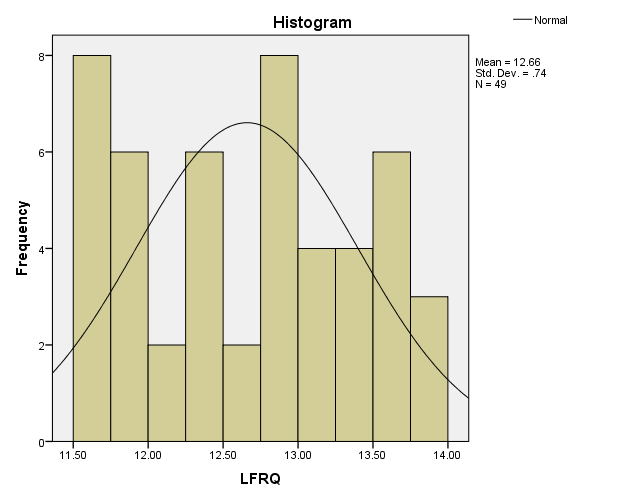 A normality test (see Table 3) was conducted with the aid of Kolmogorov–Smirnov and Shapiro–Wilk tests and Figure 2 shows the histogram. The Kolmogorov–Smirnov test results showed a statistic value of 0.118 and a probability value of 0.086, which is not too far from the point of zero but is higher than 0.05, which means that the data is typically distributed. The Shapiro–Wilk test indicated a test statistic of 0.936 with a probability value of 0.010, which is not higher than 0.05, but the Kolmogorov–Smirnov test and the histogram, which is relatively bell-shaped, indicate that the data is relatively customarily distributed (see Figure 2).