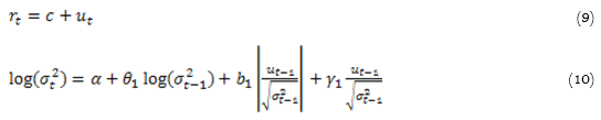 For the fourth GARCH, we estimated the EGARCH. Nelson (1991) introduced the exponential GARCH (EGARCH) model to capture shocks’ asymmetric effects, such as new policies, news and incidents. The EGARCH(1,1) is shown in Equations 9 and 10. In this model, the logarithms of volatility are performed. It transforms the asymmetric effect into exponential rather than quadratic and ensures the parameter estimates are positive. Parameterthat is statistically equal to zero implies a symmetric model and a negative