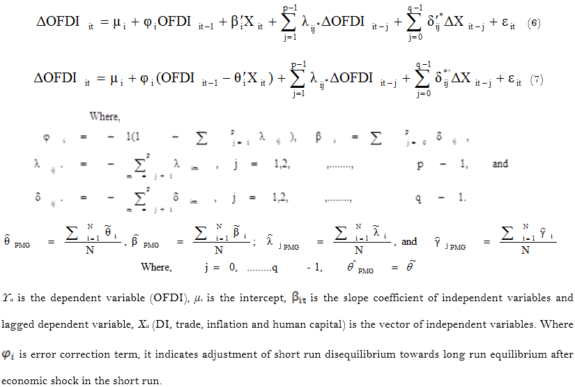 First of all, the cross-sectional dependency (CD) and CIPS panel unit root tests were applied to examine whether these models can solve the problem of CD and non-stationary residual. Based on the outcome of the CD test, additional panel cointegration approaches were applied since the level of OFDI by one country is expected to have an impact on the level of foreign direct investment outflows of another country. Thus, the presence of CD is a possibility in GCC economies. Chudik and Pesaran (2015) recently developed a cross-sectional augmented ARDL approach to control cross-sectional dependence error processes as cross-correlation occurs very frequently due to spatial spillover effects, omitted common factors and interactions within socioeconomic networks. Thus, we have applied the CD-ARDL method by using the mean group (MG) estimator developed by Pesaran and Smith (1995) and the pooled mean group (PMG) and dynamic fixed effect (DFE), which were developed by Pesaran et al. (1999), to control cross-sectional dependency by taking cross-sectional mean averages of independent and lagged dependent variables over a period of time in our sample countries. Furthermore, we have applied MG, PMG and DFE approaches to measure short-run and long-run effects of direct investment on OFDI by relaxing the assumption of cross-sectional dependency and by accounting for the heterogeneity. Additionally, the dynamic ordinary least squares (DOLS) and feasible modified ordinary least squares (FMOLS) approaches were applied as robust checks of our estimations. We used the above estimators to estimate the following panel regression shown by Equation 2: