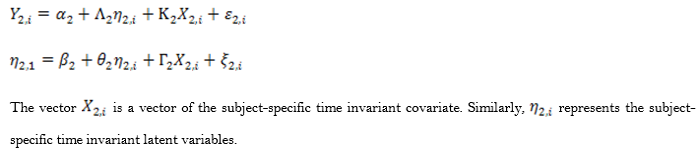 The DSEM is analyzed on two levels. That is, the between-level and within level stages of analysis. The between level analysis looks at the relationship among the subjects and are therefore subject-specific effects. Whereas the within-level measures the temporal relationship based on a specific locational deviation for the observations (Hamaker, Asparouhov, Bose, Schmied, & Muthen, 2018). In effect, both between-level and within-level effects are modelled separately in a DSEM structure. The between-level model is captured by thewhich is time invariant and is modelled as: