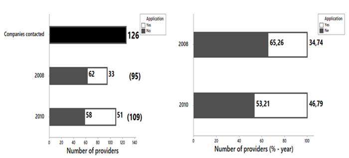 For 2008, 95 respondents (75.40% of the total number of 126 contacted companies) provided the required data. The number of respondents who provided data for 2010 rose to 109 (86.51%) (see Table 1 and Figure 1).