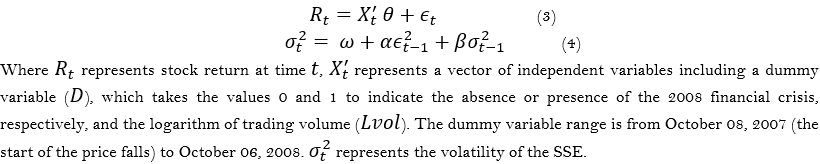 Table 1 presents the descriptive properties of the SSE returns and the logarithm of trading volume (Lvol). The results show that the average return during the study sample is -0.0016 for the SSE. The variables' distributional properties show that the series distribution is far from normal, with excess kurtosis in the SSE returns of approximately 38.2.