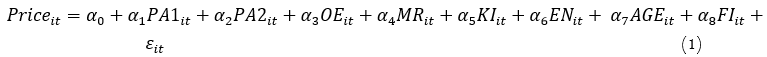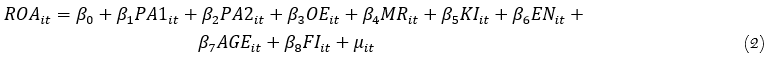 Equations 1–3 represent the panel data model of Price, ROA and ROE, respectively. The dependent variable includes stock of price (Price), total return on assets (ROA), and return on equity (ROE). In terms of independent variables, it includes the number of patents (PA1), a patented dummy variable (PA2), operating expenses (OE), market share (MR), capital intensity (KI), company size (EN), year of establishment (AGE), and foreign ownership (FI).