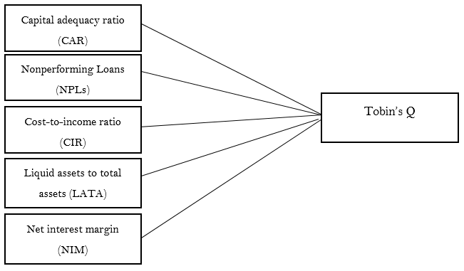 The banking sector serves as an intermediary institution, obtaining funds from parties with excess funds and distributing them in the form of credit to those who need it. By monitoring and carefully choosing depositors and borrowers, the banking sector can avoid moral hazard issues and adverse selection (Berger, Demirguc-Kunt, Levine, & Haubrich, 2004). Firm value is important to increase the wealth of shareholders (Kim, Henderson Jr, & Garrison, 1993). The market price of a share is a key factor in determining a firm’s value because an increase in the share price will also increase the firm's worth, which could lead to increased shareholder wealth (Endri & Fathony, 2020). Investors utilize financial ratios to determine a firm's market worth. This ratio allows management to understand how investors evaluate the firm’s historical performance and potential in the future. Tobin's Q is one of the ratios used to calculate the firm's market value.