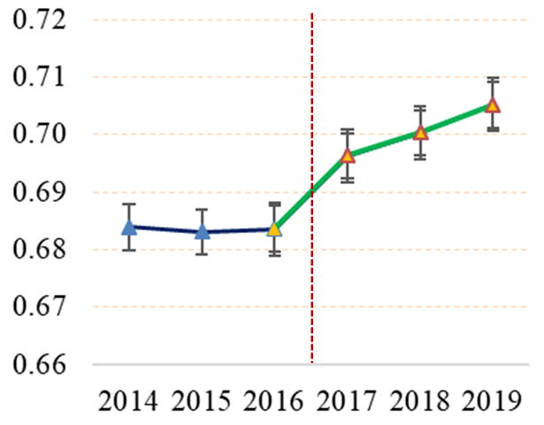 Figure 3 shows the CEI averages of the 81 countries in the data sample, and Figure 4 shows the CEI of Vietnam during the 2014–2019 period compared to ASEAN-6 countries. Generally, the average CEI of all countries improved consistently from 2014 to 2019. There was a great improvement, in particular, from 2017 compared to the years before, which may have resulted from the Agreement on Trade Facilitation when it came into force in 2017. Regarding the improvement in the customs environment index during this period, Argentina was the leading country, followed by Saudi Arabia, India, China, and Romania. For Vietnam, the CEI also showed an improvement during this period; there was an increase from 0.5705 points in 2014 to 0.5920 points in 2019. With this performance, Vietnam joined the group of countries that showed a moderate performance in terms of the CEI and ranked 36th out of 81 investigated countries in terms of the CEI improvement from 2014–2019. However, compared to ASEAN-6 countries, Vietnam had a modest performance in terms of the CEI, while Singapore always had the best performance. This implies that Vietnam needs to set clear targets and make a big effort to improve its customs environment.