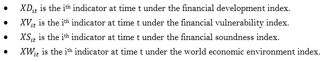 Second, the standardized individual variables are aggregated into sub-indices that indicate conditions relating to financial development, financial vulnerability, financial soundness and external economic environment. This aggregation was achieved through Equations 1 to 4.