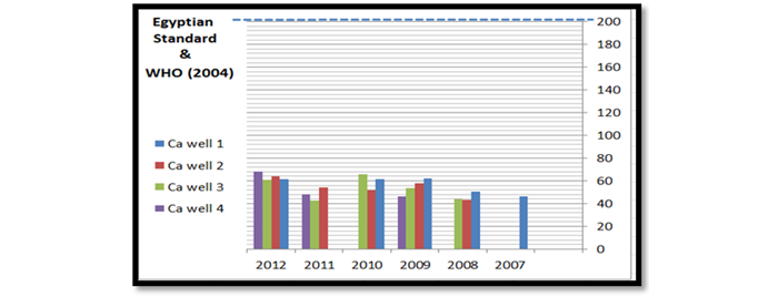 Figure-7. Calcium concentration of results of our studied wells camper with Egyptian standard & WHO [11]