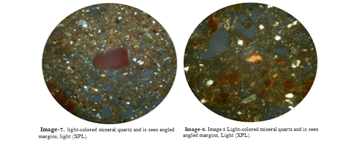 Iron oxide minerals can be seen in abundance as a red- dark red color in the sample, it also looks great up to two millimeters and total volume of the sample is formed about 15% (Fig. 8). Other components of sample are remains of Igneous Rocks, Feldspar, Amphibole and Pyroxene which is partially seen in the sample (Figures 6, 7, 8).