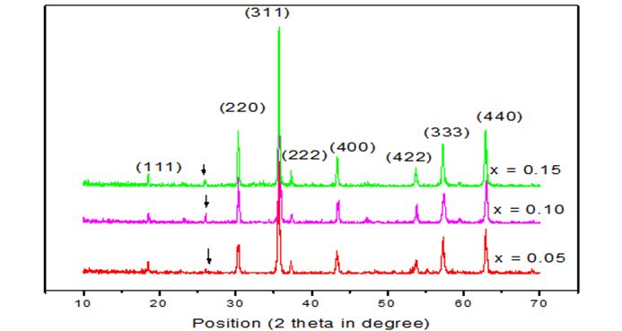 XRD patterns are demonstrated in the Figure-(b) for Eu3+ doped samples of Ni0.60Zn0.40-xEuxFe2O4[x = 0.05, 0.10 and 0.15] ferrites sintered at 12500 C for 3 hrs. It is clearly noticed that with Eu3+ doped samples additional peaks other than spinel structure and probably corresponding to a second phase of EuFeO3 (Ortho ferrite) shown in Figure-1. Determination of exact phase could not be possible, since the number of extra peaks other than spinel is not sufficient for accurate analysis. XRD analysis evidenced that the compounds containing Eu3+ions are pluri-phasic. Rare earth is formed orthoferrite (REFeO3) phase and the formation of these secondary phases in ferrite during sintering process was governed by the type and the amount of RE3+[ Eu3+] ions used.