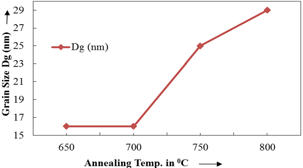 One of the most important aims of this study was to determine crystalline grain size for all the annealing temperatures. Grain size of all annealed samples of the alloy composition was determined using Scherrer method [14]. Grain size was determined from XRD pattern of (110) reflection for different annealing temperatures at constant annealing time 30 minutes from which grain size was determined using the formula