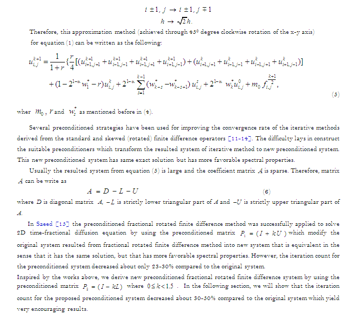 ]. It is noteworthy to observe that the finite difference schemes derived from skewed (rotated) difference operators have been extensively investigated over the years for solving FPDE's. These iterative methods have been shown to be much faster than the methods based on the standard five-point formula which is due to the formers’ overall lower computational complexities (Saeed and Ali [5