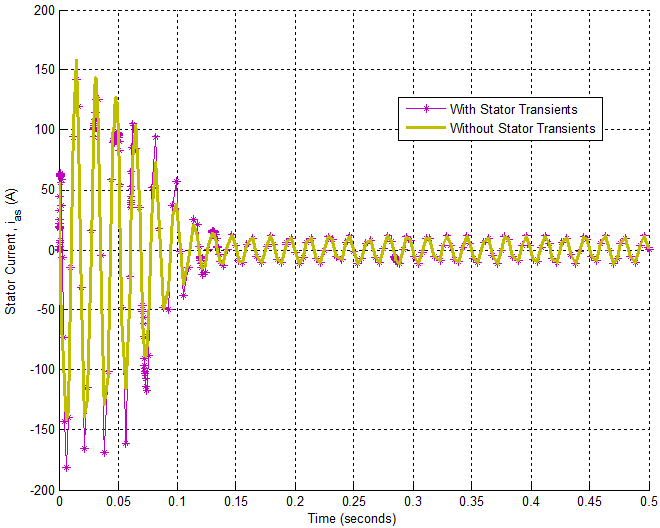 From Figure 5, the two plots, with stator transients and without stator transients, have no much difference. They have same steady state value and they reach this value at the same time, 0.15 second. They have approximately same maximum and minimum values. The transient characteristics are closely similar. Thus, we can conclude that the reduced model can be used effectively to determine the stator currents’ characteristics of an induction motor.