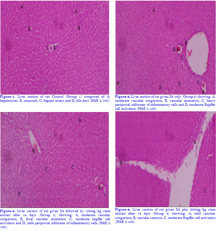 Histopathological assessment of liver tissues showed that there were no visible lesions in the liver of the animals in the control group. In contrast, exposure to sodium arsenite alone produced vascular congestion and ulceration, infiltration of inflammatory cells and moderate Kupffer cell activation. On administration of graded doses of ethanol stem bark extract, 14 days later and simultaneously, there was mild amelioration of the hepatitis with the first modality and a better amelioration with the simultaneous treatment. This is consistent with findings from previous studies on the hepatotoxicity of sodium arsenite [74, 75