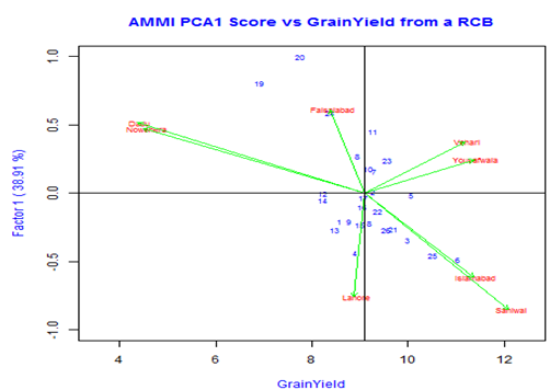 The GGE biplot analysis based on AMMI model for the first two IPC scores (PC1 vs PC2) was presented in Figure-2. The GGE biplots based on the performance of 26 maize hybrids evaluated under 8 environments were constructed based on the values of the first two interactions principal component scores (PC1 and PC2) which explained 62.6% of the grain yield variation due to genotype and G x E interaction (Figure 2). Figure-2 shows the association or relationship between the different environments. Faisalabad was the most discriminating environment due to its longest distance from the origin of the biplot. Environments with small vector angles tend to have closer similarity and those with wide vector angles show minimum association. Similarly the rug plot also displays the proximity among the different environments based on the angle variation of the vectors. All the managed drought environments were displayed close to each other as their deviation from each other was small.
