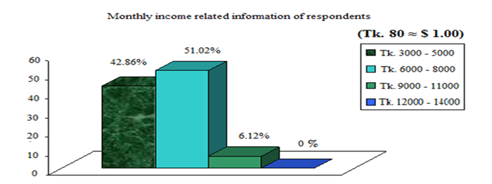 In order to get the economic and social status of Mahali people we collect the information related to the monthly income of Mahali people which has been depicted in the bar diagram (Fig. 3). The monthly income of about 51% of total respondents was 6000 to 8000 Tk. while there are not a single person whose monthly income is more than 12000 Tk.