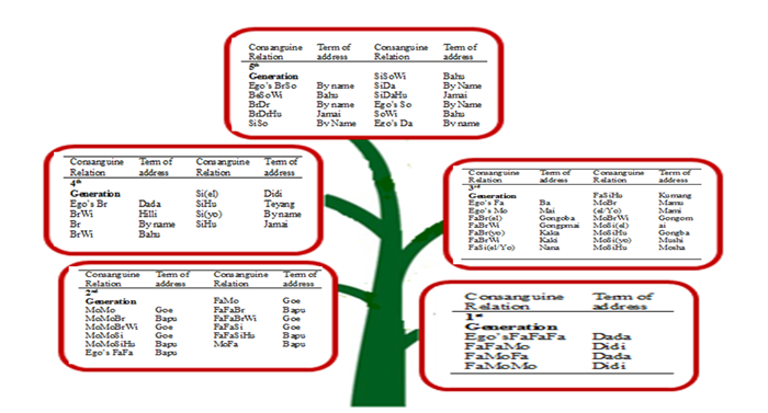 The Mahali system of kinship is of the kind of termed as “Descriptive System”. But in case of ego’s own generation, the kinship system can be termed as “Classificatory System” because a boy or a girl addresses his/her parallel or cross-cousins with the same term he/she addresses his/her own elder brother or sister. Mahali kinship terminology has been influenced by the Muslim, Hindu and the Santal kinship terminology. They have lost many of their own terms and have borrowed different terms from their neighboring communities, such as dada, didi, baba, ma etc. There is an especial system among the Mahali for selection of the name of son and daughter. The eldest son is given the name of parental grandfather and the second son is named after the maternal grandfather, the third that of the parental grandfather’s brother and the fourth that of the maternal grandfather’s brother. The daughters are given the names of equivalent female relations in the same order. If there is a Ghar-Jamai or a husband living in wife’s father’s house, then the naming order will be reversed, i.e. the name of the maternal side come first. The following diagram (Fig.5) illustrates the kingship terminology (Consanguine) used among the Mahalis in different generations and the Table 3 demonstrate the kinship terminology of the Mahalis in terms of address (Affinal relation).