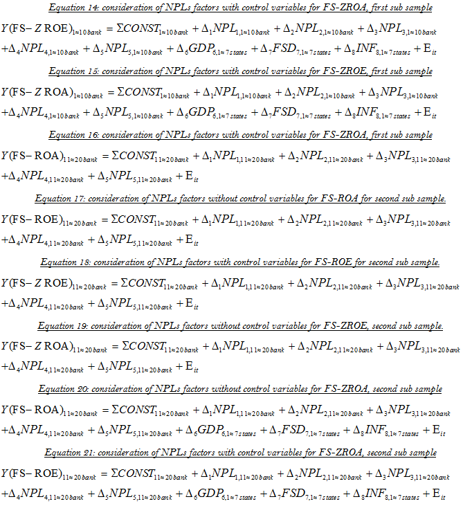 Equation 7 & 8 explains the effect of asset quality factors (NPLs) for the fourth indicator of financial stability; ZROE, and for the control variables respectively. The effect of unobserved factors is under observation through error factors of the model, entitled as E for entities (i) and time period (t). Besides Equation 9 and 10 reflects the econometric relationship between financial stability through ROA and ROE for first sub sample (1-10 banks).