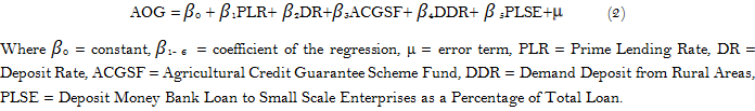 A model of financial inclusion and agricultural sector output was used to address objective two of the study. The model for financial inclusion in this study depends on the work of Onaolapo (2015) in his study of the “effects of financial inclusion on the economic growth”, and the per capita income, the number of commercial banks branches, the bank loans to rural areas, the demand deposit from rural areas and the agricultural guarantee scheme fund were used as explanatory variables in examining financial inclusions and were represented in the econometric model as