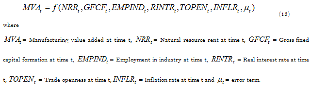 In this study, we assume that the extent of natural resource endowments in an economy is an important determinant of its real growth rate, with particular reference to the manufacturing sector. As observed by Kronenberg (2002), many industries make use of natural resources such as iron, coal, and oil as inputs in their production process. The study noted that it is expected that the abundance of one factor input should raise the marginal product of other factors. For instance, a rise in labour input can raise the marginal product of capital input and thus contribute to economic growth. Our stance relies on the endogenous growth literature by Romer (1986