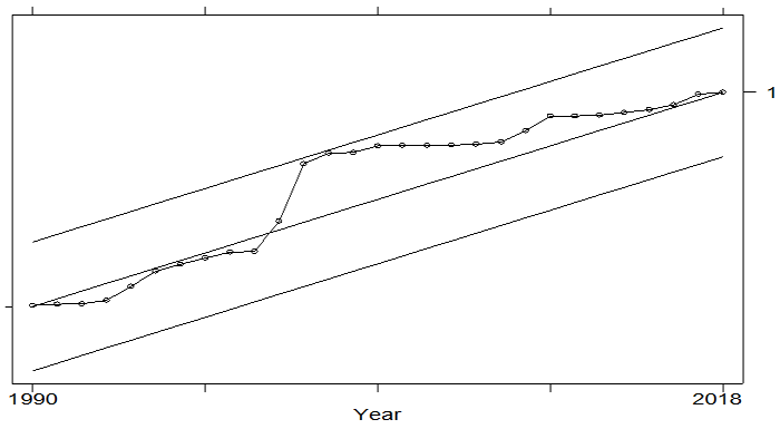 Where Δ represents the first difference operator, while k is optimal lag lengths. In order to estimate co-integration among the factors, might be applied the ARDL bounds test based on the Joint F-statistics or Wald test, of the coefficients for the lagged levels in Equation 3, under the null hypothesis which assume that no co-integration among the series (H0: λ1 = λ2 = λ3 = λ4 = 0) against the alternative hypothesis of exist co-integration (H1: λ1 ≠ λ2 ≠ λ3 ≠ λ4 ≠ 0).