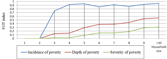 By considering different family size of rural households, the incidence of poverty is increasing as household number increasing up to the household having 5 members. But, the poverty gap and severity of poverty is becoming high as numbers of the household members increasing. The household having 1 and 2 members escaped from incidence, depth and severity of rural poverty in Kola agro-ecological zone of the Humbo Woreda.