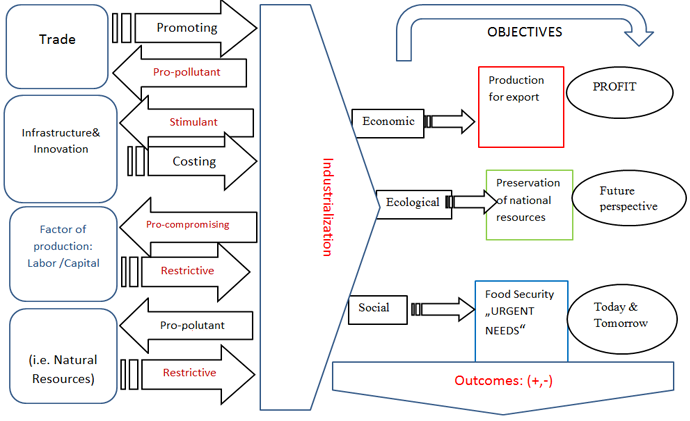 ). Therefore, to conceptualize the linkage between trade and other factors with industrialization phenomenon, Figure 5 illustrates these relationships considering the contradicting motivating factors, in our case, trade, Infrastructure, and factor of production (labor), and the overall consequences that can be positive or negative; however that beyond the scope of this study and so do the environmental factor.