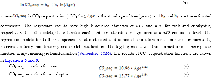 The above functions show that at a stand age of one, eucalyptus sequestrates 12.77 tCO2/ha, which is higher than 10.96 tCO2/ha for teak. Eucalyptus sequestrates more than teak as stand age increases. To calculate the economic value of CO2 sequestration in a value of dollars per hectare, CO2 sequestration based on a stand age is multiplied by the value of SCC.