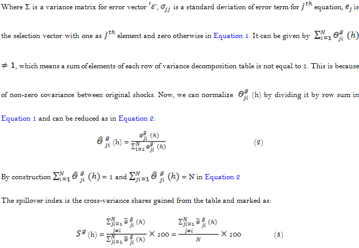 We examine the issue employing the time series VAR model. VAR model is a natural tool for macroeconomic analysis since it captures both contemporaneous links (Lütkepohl, 2011) and lagged information of series. It matters for uncovering the effects of cross-country financial shocks spillover. To look at the extent of spillover, we have employed Diebold and Yilmaz (2009