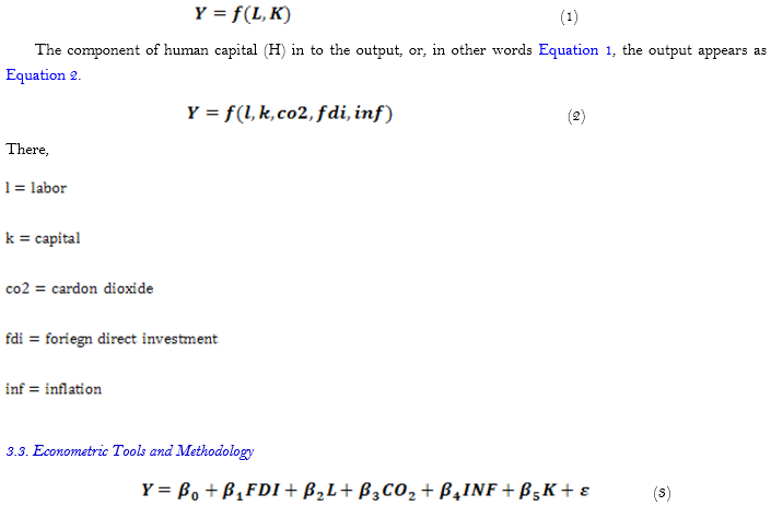 The econometric model for the study is given in the Equation 3. Where, FDI is foreign Direct Investment, CO2 is carbon Dioxide, Inf is Inflation rate, L is Labor force, K is capital and e is error term. The coefficient of each variables is discussed in detail in Table 1.