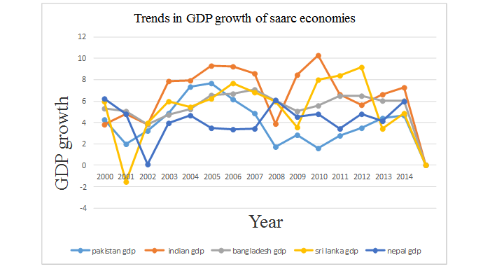 This figure demonstrates the GDP growth of SAARC countries. India has a great economy and strong agricultural development and having industrial which makes India at the highest of the SAARC countries in admiration with GDP progress. Pakistan has 2nd position in SAARC with admiration to GDP development then Bangladesh, Sri Lanka and Nepal correspondingly at the GDP growing chart in SAARC countries.