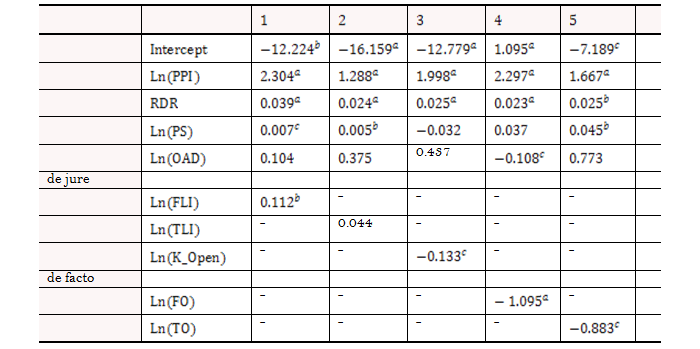 Note: Ln stands for natural logarithms, PPI for per capita real private income, RDR for real deposit rate, PS for real public savings, OAD for old age dependency, FO for financial openness index, FLI for financial liberalization index, TLI trade liberalization index, K_Open for capital account liberalization index, FO for financial openness, and TO for trade openness.