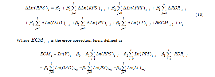 The Schwarz Bayesian Criterion (SBC) is used in order to determine the optimum lags. The ARDL based error correction model (ECM) can be written as followings:
