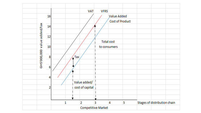 One of the problems cited by some experts and businesses in Ghana against the introduction of VAT flat rate scheme (VFRS) is the cascading effect of the tax (ghananewsonline.com.gh, July, 2017). Cascading tax effect in taxation is a situation where tax is charged or paid on tax. A good taxation regime always takes step to avoid “taxation over taxes” or “cascading-effect” of the incident taxes (Kumar, 2012 ). Cascading-effect adds to the cost to the final consumer, deadweight loss, and slump in total surplus of supply chain consisting of supplier, manufacturer, retailer and consumer (Kumar, 2012