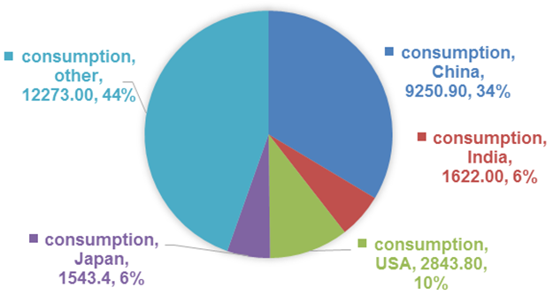 Figure 1 reveals the world NR production while figure 2 reveals the world NR consumption as of 2016. According to International Rubber Study Group (IRSG), the top five NR producing countries are Thailand, Indonesia, Malaysia, Vietnam and Myanmar; while the top four NR consuming countries are China, India, USA and Japan. According to the statistics from the Association of Natural Rubber Producing Countries (ANRPC, 2017 ) the NR world production increased from 12.43 million tonnes in 2016 to 13.28 million tonnes in 2017. There was approximately 90% of the world NR supply is produced by ANRPC member countries especially produces from the top five NR producers namely Thailand, Indonesia, Malaysia, Vietnam and Myanmar due to the optimal conditions for the growth of rubber trees. Also, about 70% of the global demand for NR derived from the top four NR consumers namely China, India, USA and Japan mostly for the automobile and auto-tire industries. On the other hand, for the world NR consumption, it showed an increase of 1.4% and the total of 12.9 million tonnes as of year 2017.