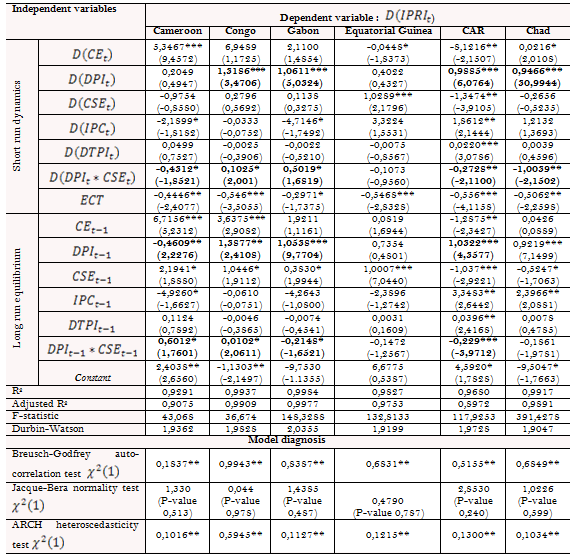 As regards the effect of the socio-economic conditions on the relationship between public and private investment, the analysis of the interactive variables (DPI*CSE) enables us to observe that in the short run, an improvement in the socio-economic climate reinforces the positive and significant effect of public investments on the productivity of the private sector in Gabon and Congo. However, in Cameroon, Equatorial Guinea, Chad and the CAR, the socio-economic conditions deteriorate the contribution of public expenditure on the productivity of private investments. In the long run, the positive sign of the socio-economic climate comes to reduce the negative effect of public investments on private sector investment in Cameroon. In Congo, it comes to reinforce the positive and significant effect of public investments. However, the negative effect of the socio-economic climate of Gabon and the CAR reduce the effectiveness of public investment expenditure.