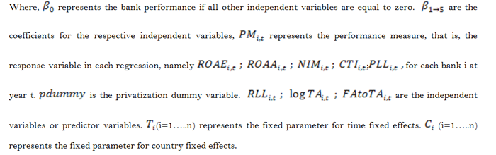 Another study by Ghosh (2010) investigated the effect of privatization on the Indian banking sector. Diverse financial measures were used in the study for the measurement of performance, including: ROA to measure profitability, NIM to measure economic efficiency, Non-performing loans to total loan ratio (NPL) to measure bank risk, and capital adequacy ratio (CAR) to measure bank soundness. The main finding of this study is that there is a positive relationship between privatization and bank performance. It was found that partially privatized banks had a significant superiority in terms of profitability over fully state-owned banks. Additionally, it is concluded that profitability, efficiency, and bank soundness were enhanced after privatization; and bank risk decreased as a result (although over a longer time period). In the same vein, Kamaly et al. (2015) also found positive results with regards to effect of privatization on profitability, efficiency, liquidity, and banking effectiveness in the Egyptian banking sector. Likewise, Boubakri et al. (2005) test the performance of privatized banks in a sample of 22 developing countries and find evidence that privatized banks have lower economic efficiency, lower solvency than government owned banks, and profitability increases in post-privatization period. Regarding the MENA region, Naceur et al. (2007) argue that privatized banks experience an increase in profitability and operating efficiency, and decreases in employment and leverage in four MENA countries; Tunisia, Turkey, Egypt and Morocco. Moreover, Omran (2007) also agrees with Choi and Hasan (2011) and Rumler and Waschiczek (2012) that no solid findings on the effect of privatization on bank performance were concluded, although Omran (2007) showcases evidence to support privatization. This study focused on studying the impact of privatization of state-owned banks on Egyptian banks’ financial and operational performance. Findings indicated that profitability and liquidity ratios for privatized banks declined noticeably, while other performance measures relatively remained the same after privatization. However, it was found that privatized banks performed better than mixed banks. In spite of these findings, the study found strong evidence to support that banks with greater private ownership perform better than those with less or only partial private ownership.