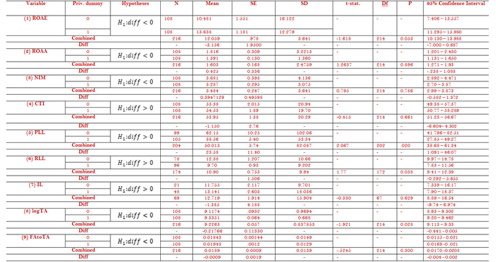 Moreover, ROAE increased after privatization, but this result is not statistically significant. NIM decreased after privatization with this result also being not statistically significant, which is also the same result found in the regression output in Table (6). On the other hand, CTI decreased after privatization at a significance level of 10%. Therefore, we reject the null hypothesis and accept the alternate hypothesis that decreased CTI (or higher cost efficiency) is associated with privatization It can be inferred that the decreasing CTI indicates that privatized banks experience higher cost efficiency as a result of privatization, due to the fact that the total cost is managed more efficiently after privatization, showing that operating costs have decreased relative to operating income. Additionally, PLL decreases after privatization at a 5% significance level, thus we reject the null hypothesis and accept the alternate hypothesis that decreased PLL (or decreased bank risk) is associated with privatization. It can be said that privatized banks indeed face lower bank risk and improved asset quality, because they are subjected to less loan losses and consequently incur a lower PLL expense.