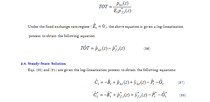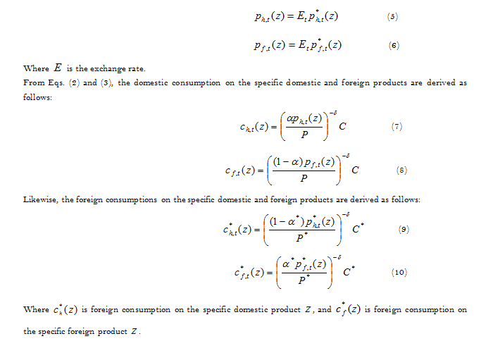 We use the log linearized price index (Eqs. (22) and (23)), the log linearized law of one price (Eqs. (25) and (26)), the log linearized world consumption (Eq. (28)), the log linearized demand function (Eqs. (29) and (30)), the log linearized labor supply function (Eqs. (31) and (32)), the log linearized terms of trade (Eq. (36)), and log linearized private budget constraints (Eqs. (37) and (38)) to require a solution to get the equation expressing the relationship with 13 endogenous and exogenous variables, which are domestic consumption